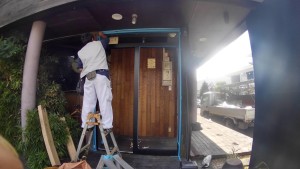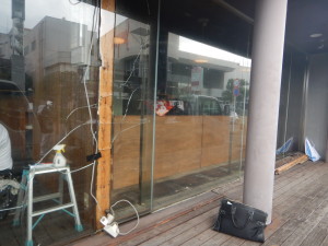 大工、サッシ屋、ガラス屋の共同作業。厚さ10mmのガラスは4人かかりで移動。お店を3日間休んでいただいての仕事になりました。